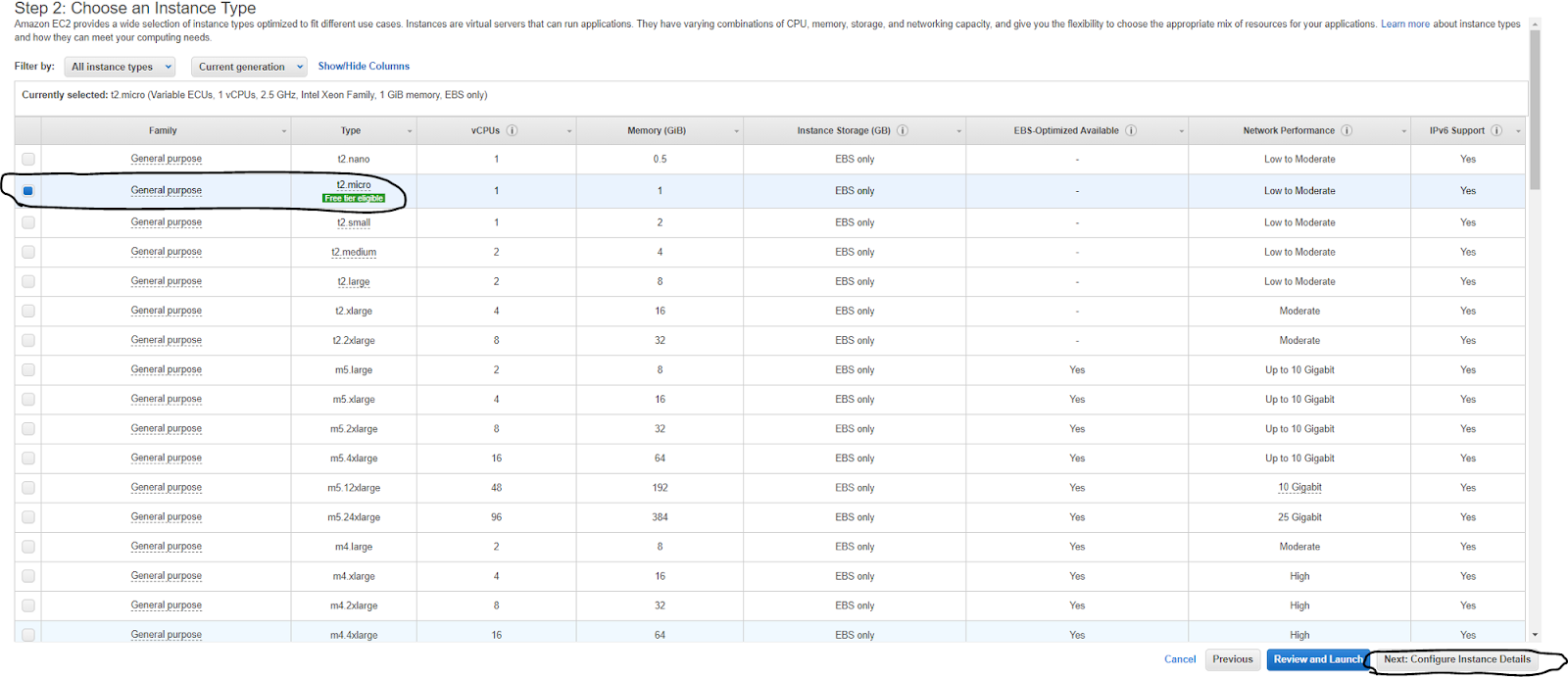 Choose an Instance Type. Choose the version titled “t2.micro” under