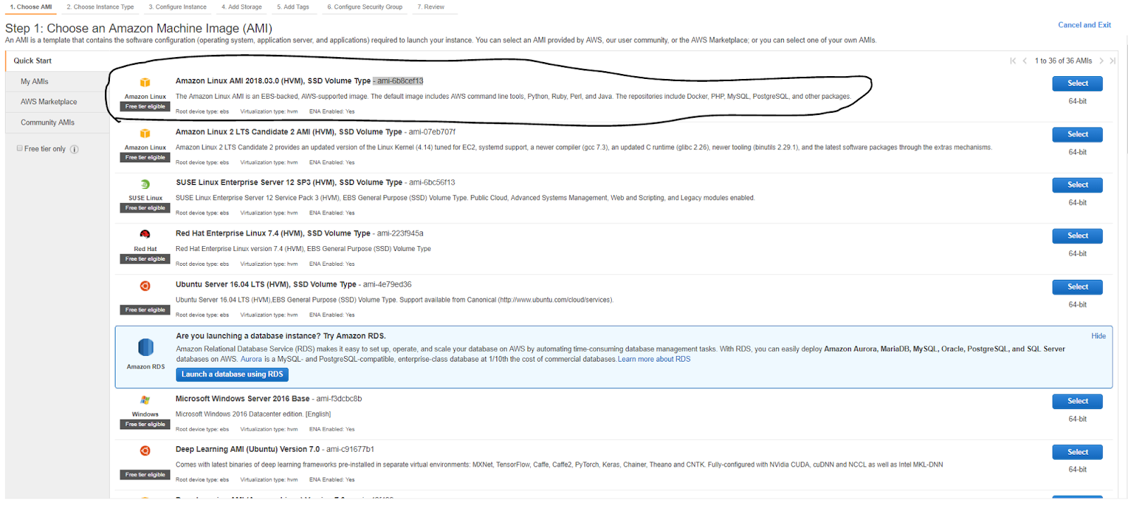 user to select the image. Choose the option titled Amazon Linux AMI