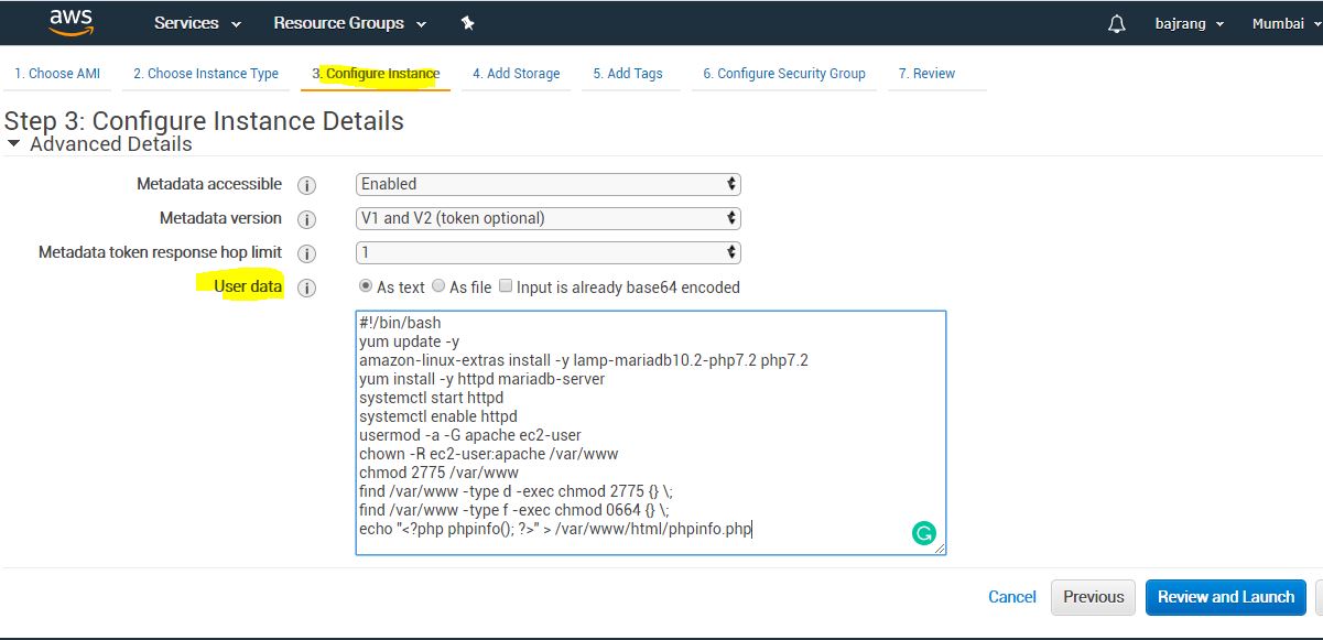 Enter the below commands in the User Data Scripts